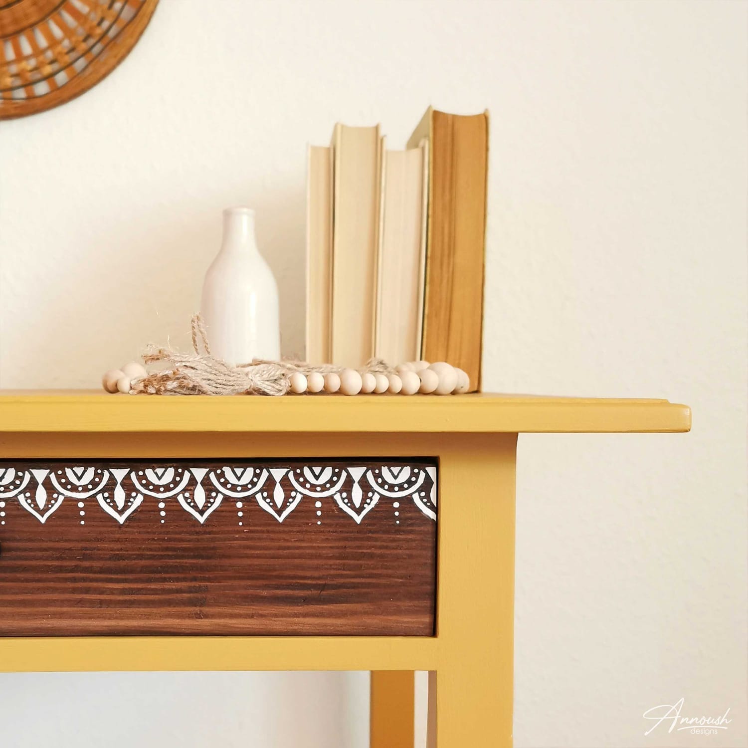 In meinem Beispiel habe ich die Schubladenfront eines alten Beistelltischs im Boho-Stil verschönert. Dafür habe ich meine eigene Schablone aus festem Papier selbst angefertigt – ein organisches Boho-Motiv ausgesucht, die passende Größe festgelegt, ausgedruckt, zugeschnitten, fertig.