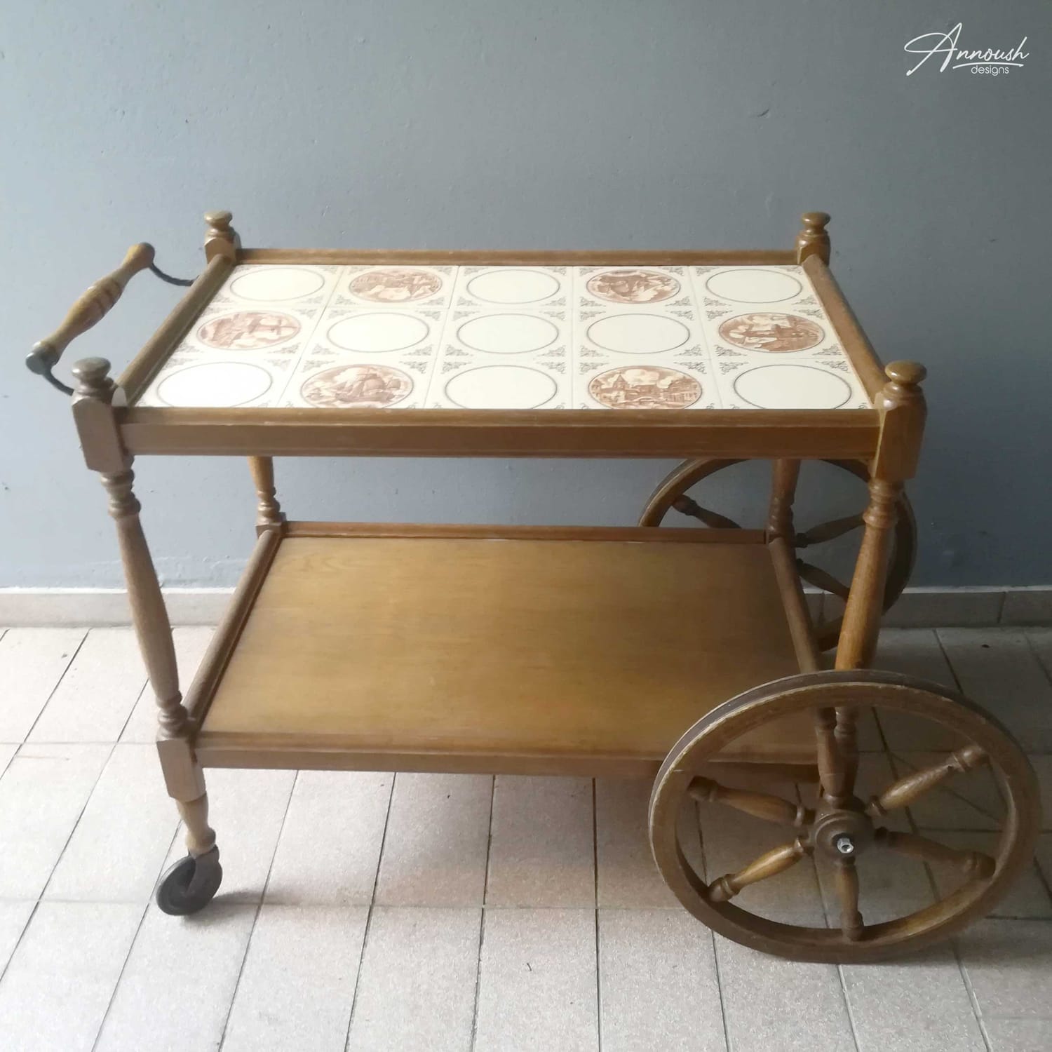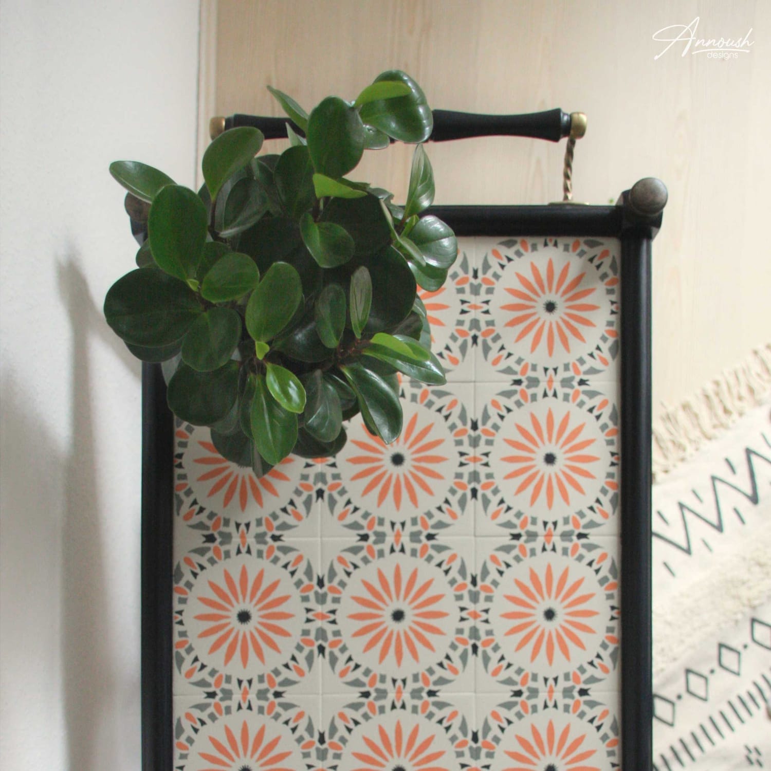 Auch Fliesen – egal ob an Wänden, auf Böden oder wie in meinem Beispiel auf einem alten Servierwagen – lassen sich mithilfe von Schablonen komplett neu interpretieren. Besonders bei Möbelstücken mit veralteten Fliesenoberflächen ist das eine tolle Möglichkeit, frischen Wind ins Design zu bringen.